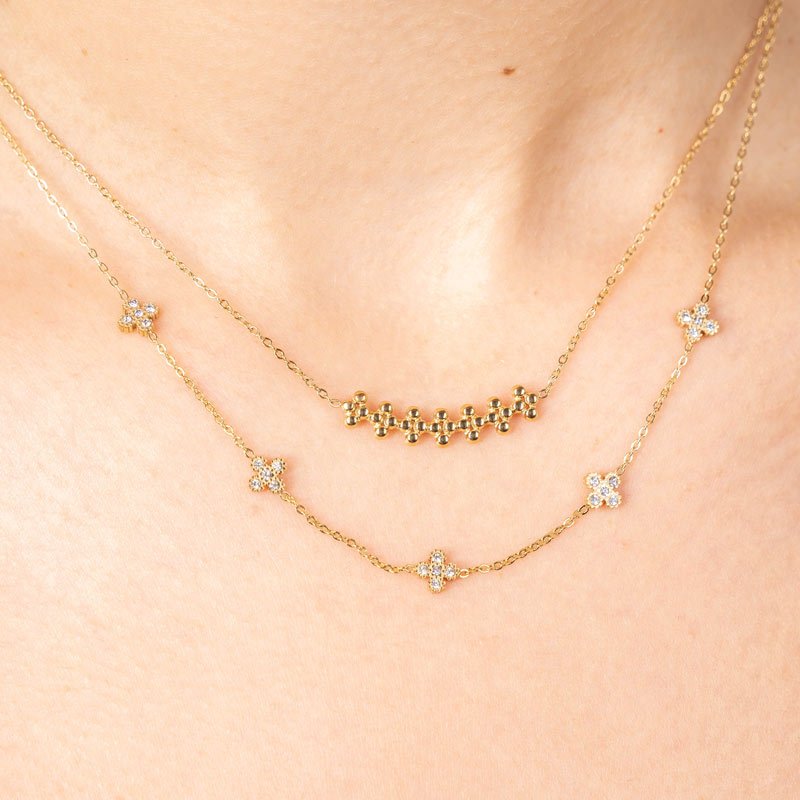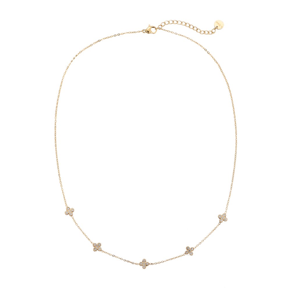 Apresentamos o colar de aço inoxidável com 5 pequenas flores, uma peça que combina elegância e modernidade. Cada flor é delicadamente incrustada com zircónias, que refletem a luz de maneira encantadora, proporcionando um brilho subtil que fará destacar-se em qualquer ocasião.
