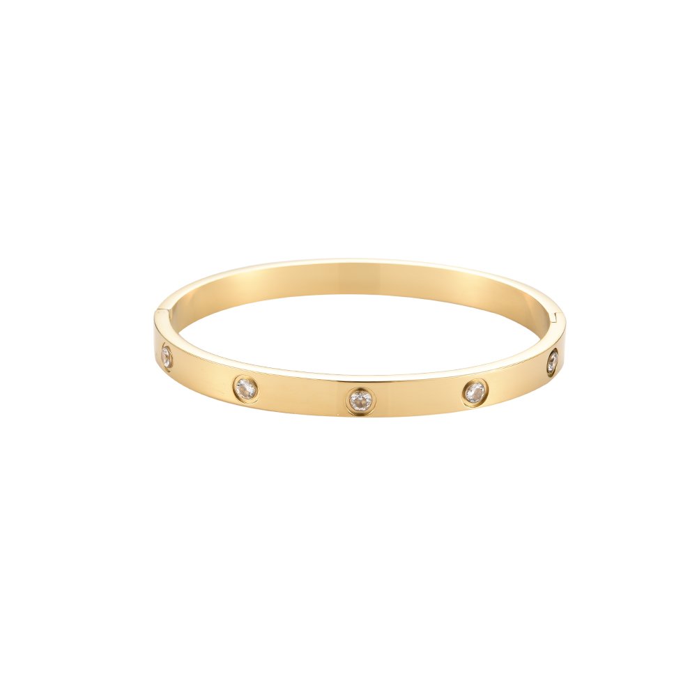 A pulseira rígida de aço inoxidável é uma peça fundamental para quem procura elegância e durabilidade. Com um design moderno, esta pulseira destaca-se pelas suas dez pedras de zircónia, que adicionam um toque de brilho e sofisticação.
